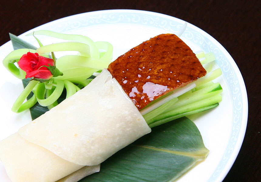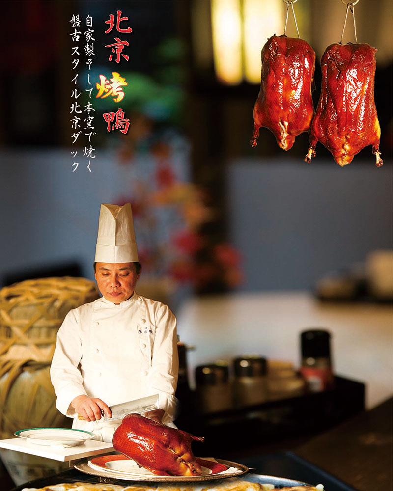 盤古創業時から絶大な人気を誇る北京ダック。一羽ご注文の際にはお客様の目の前でさばきます。